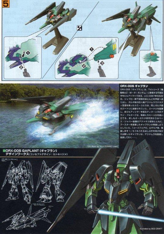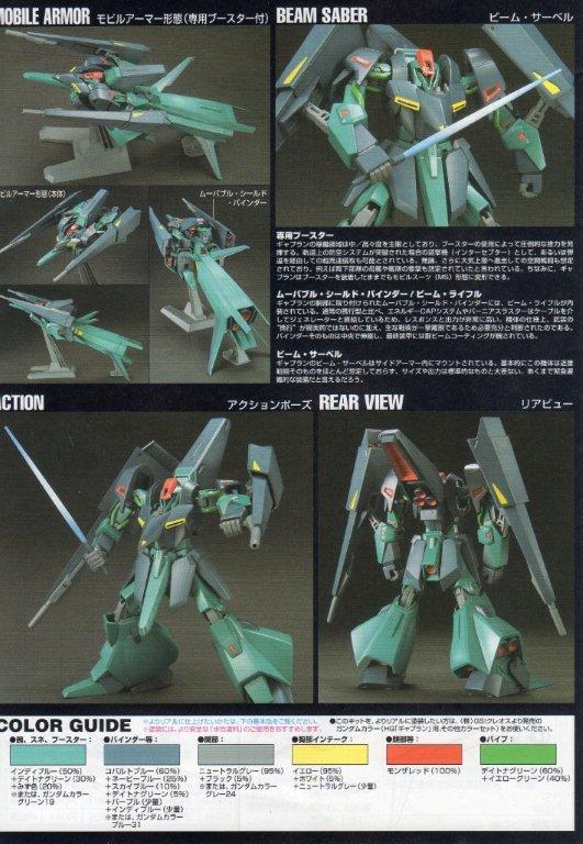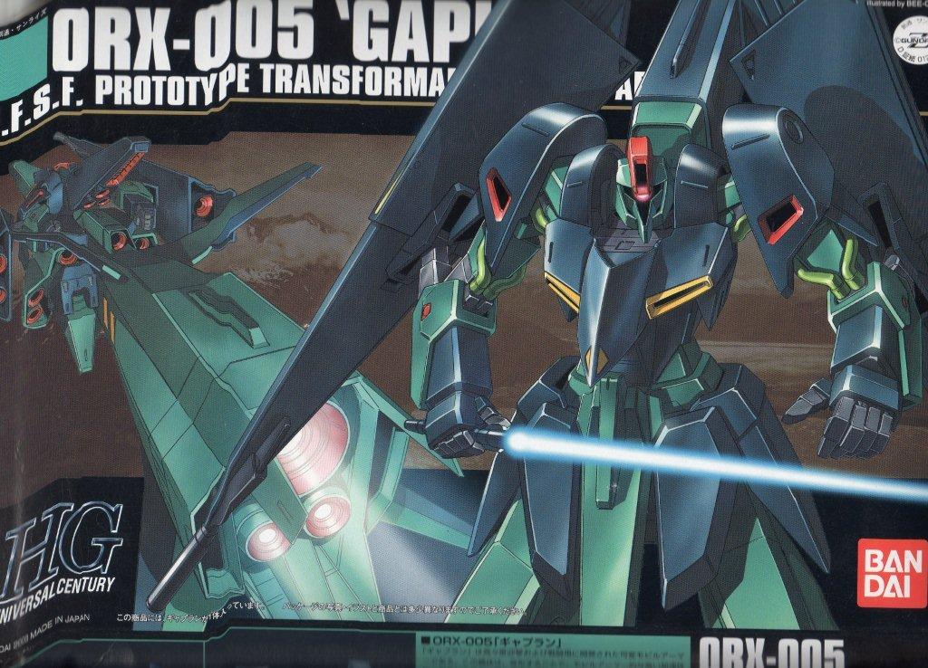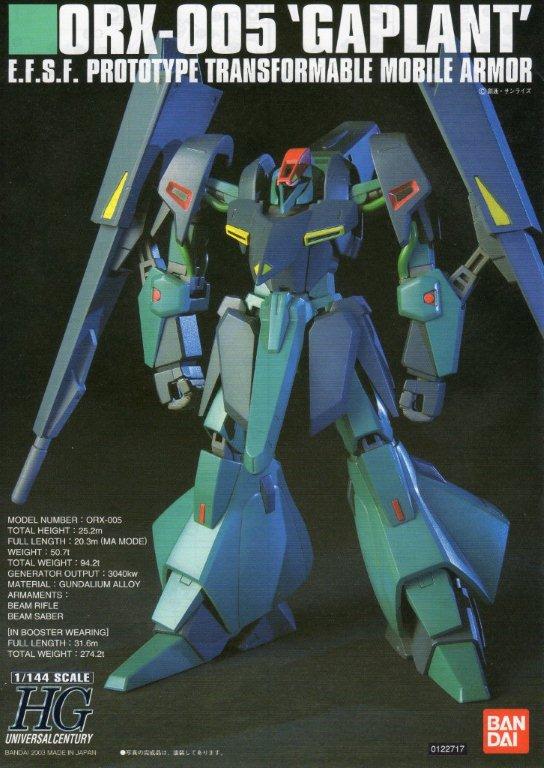 箱。 説明書。 ○機体説明 地球連邦軍のニュータイプ研究機関「オーガスタ研究所」が提出した基本設計を元に、「オークランド研究所」が開発したティターンズの超高高度迎撃用MSで、MA形態に変形する事で大気圏内での単独飛行が可能となるが、アッシマーと違いリフティングボディや熱核ジェットを持たぬ故に燃費が悪く、推進剤搭載量の関係もあって飛行航続距離は極端に短い為、大気圏内での作戦時には多くの場合、サブフライトシステムか後述の追加ブースターが不可欠だった。 加速時のGが激烈なため通常のパイロットでは乗りこなせず、実質的に耐G能力を改造されている強化人間専用機となってしまった。だが、後期生産型では改造により上限速度のリミッターを付けたり急旋回のGを緩和するOSのプラグラムを追加した一般兵でも搭乗可能な機体も生産されている。 増槽を兼ねた大型の追加ブースターを装備する事で大気圏離脱も可能。また宇宙空間でその形態ならば両側にMS1機ずつを係留して長距離を移動出来る。更にブースターを装着したままでもMSへ変形可能であるが、設定書にも書かれている通り殆ど意味がないので、劇中ではこの形態は披露される事無く終わっている。 本機最大の特徴はシールド・ビーム砲・スラスターを兼用したバインダー(ムーバルシールド。またはムーバブルシールドとも呼称される)を両腕に装備している事である。シールドにビーム砲などを仕込むことは他機でも行われているが、ここまで特化したものは他に例を見ない。これによりMS形態でもその強力な加速力が落ちる事はなく[2]、また、全周噴射可能なベクタードスラスターとしても機能する為、劇中で本機は急激な減速や方向転換等、かなりトリッキーな機動性を駆使して敵を翻弄している。 MA形態の強力な推力を利用した強襲や空中戦で活躍したが、ヤザンに「動きが硬いMS」と言われた通り、機体がやや大型なこともあり小回りが効きづらくMSに変形後はMA時より機動性は多少劣る。なおヤザンはエゥーゴのメタスと交戦した際に「こっち(ギャプラン)の能力は違う」と言っており本機を高く評価している。 (ウィキより)