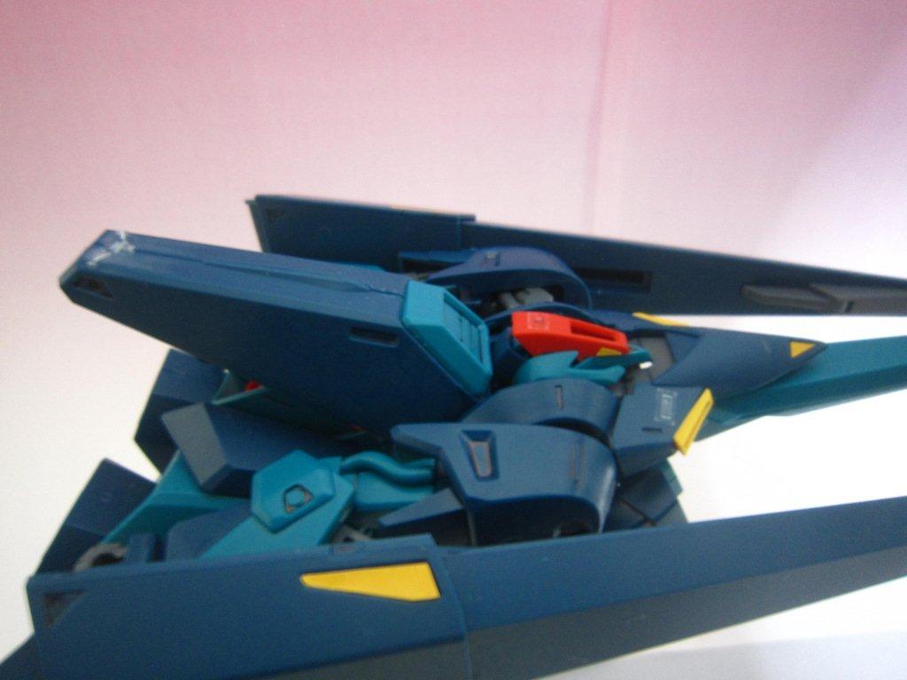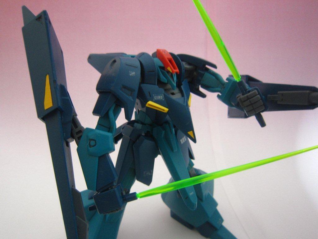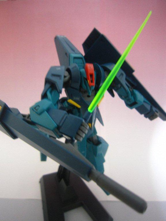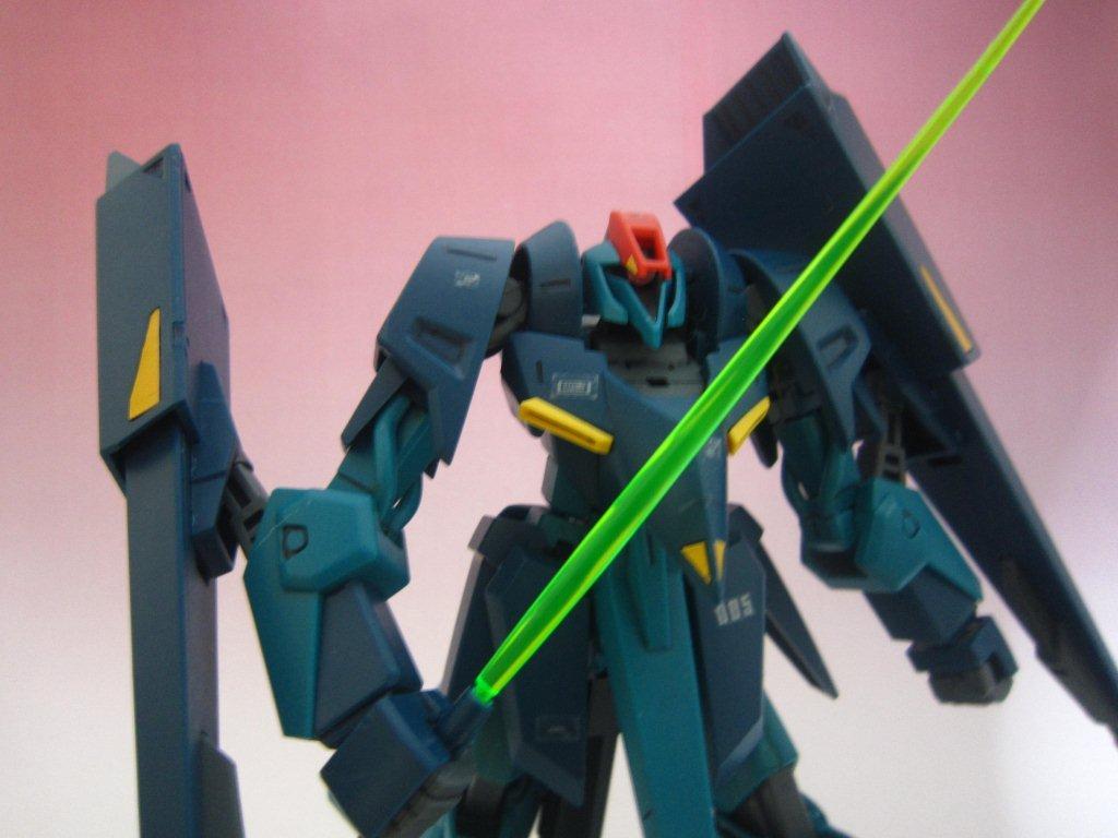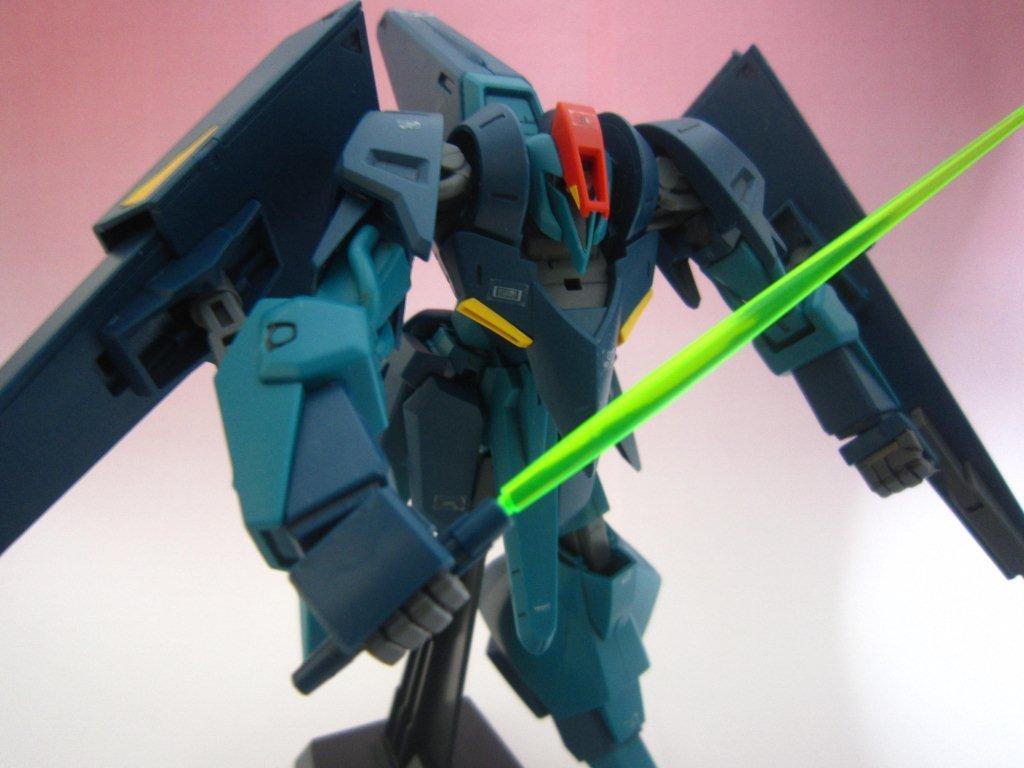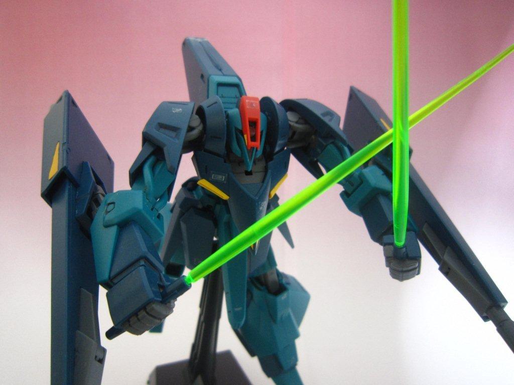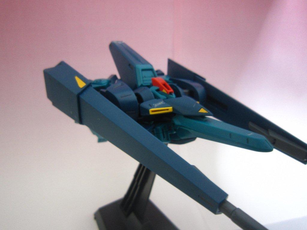 このキッドには専用台座がついてます。 ○ビームライフル。 文字通り両腕シールドバインダーに内蔵された射撃兵装。発砲時の光芒色はイエロー。MS、MA両形態で使用可能。バインダーのステーに内蔵されたパワーケーブルより直接高容量のドライブを行えるため、一般的なマニピュレーター携行モデルに比べ出力、連射性に優れる。ただしライフルシステム自体はエネルギー充填型で、第26話におけるヤザンの様に一度弾切れすると再リロード不可という欠点がある(この弾切れはヤザンの乱射が原因なので、本機の射撃回数が特に少ない訳ではない)。なお、設定によるとシールドには起動式の射撃安定用支持グリップがついているが、これが劇中で使用された事はない。