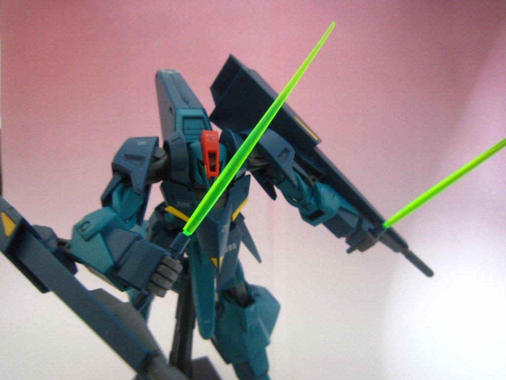 またまたビームサーベルはブーム箇所を切断し、リックディアスのサーベルをくっつけました。 二刀流です。 ○ビームサーベル サイドアーマー内に格納された接近戦用武装。ビーム刃の色はイエロー(HGUCキットの説明書ではブルーが推奨されていた)。元々大推力を活かした一撃離脱戦法を身上とするギャプランは、基本的に格闘戦そのものを想定しておらず、あくまで緊急時の自衛装備としての意味合いが強いが、劇中(TV版第25話、劇場版「II」)ではヤザンが二刀流を披露し、Ζガンダムを圧倒した。その後の作戦でもヤザンはかなりの回数格闘戦をしておりヤザンの技量もあり、Zガンダムをも追いつめた。