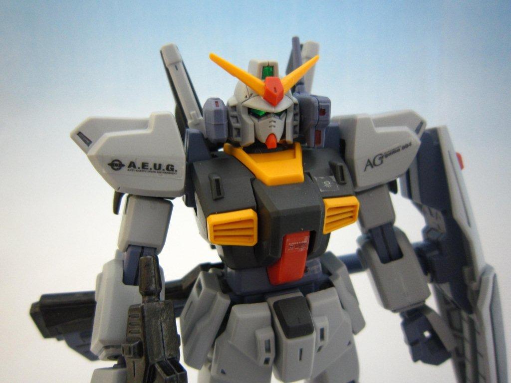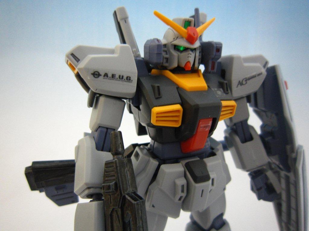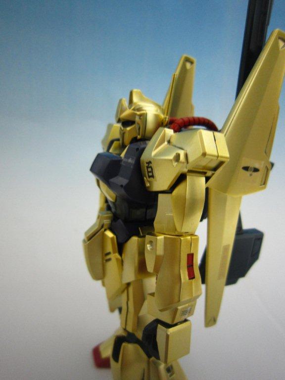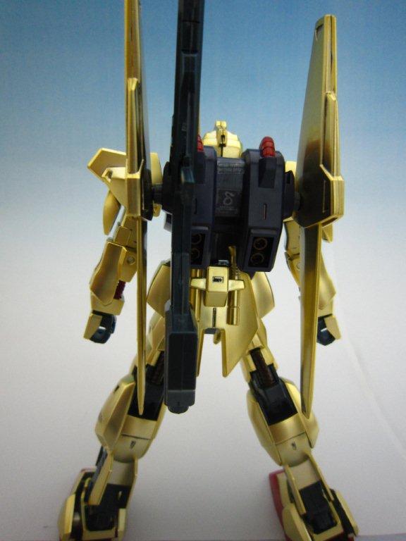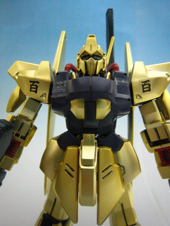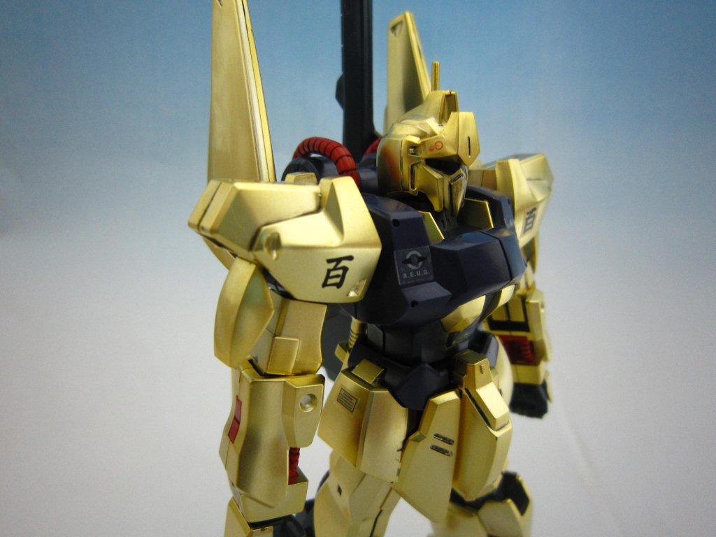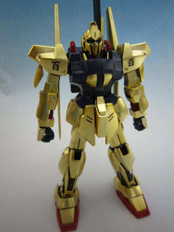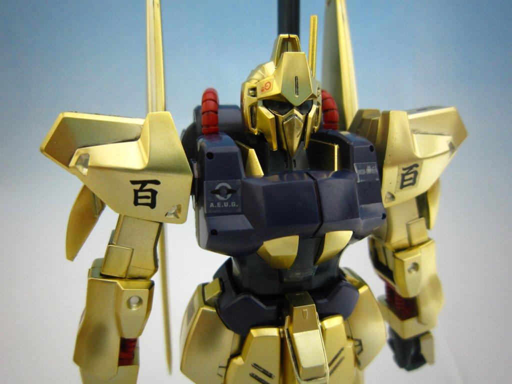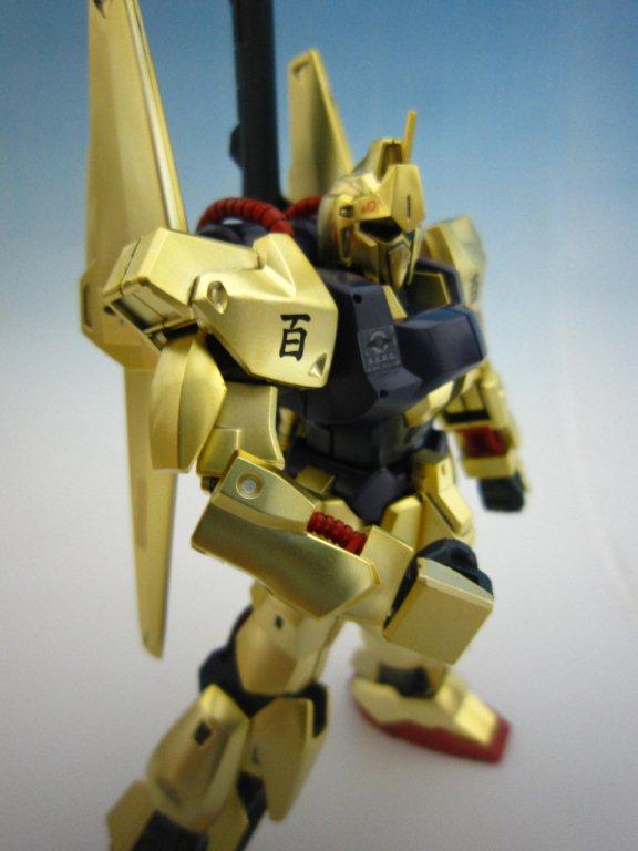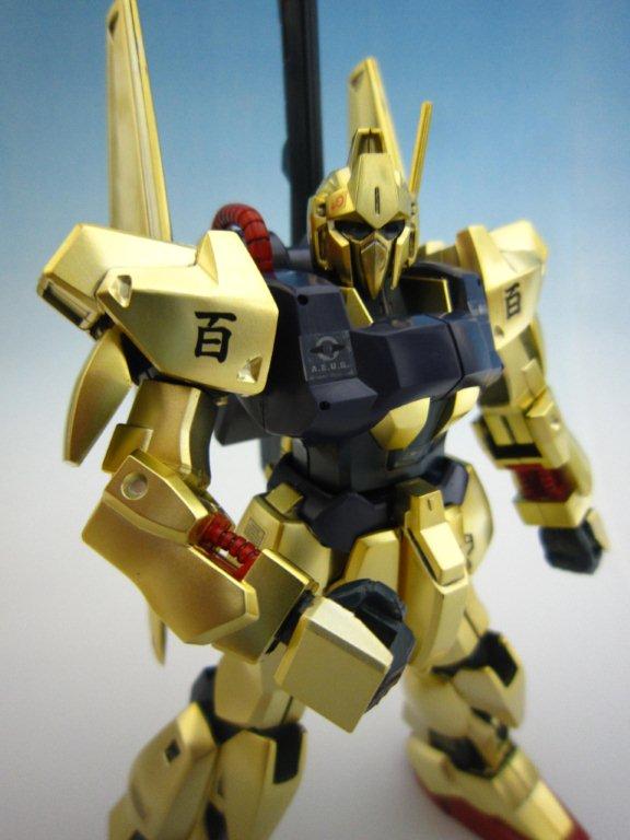 完成レビュー、基本ポーズ編です。 基本ポーズ立ち。 アップ。 ちょっと左。 けっこう右。 後ろ。 またアップ。 ○機体説明 エゥーゴとアナハイム・エレクトロニクス社による共同開発計画「Ζ計画」で開発されたアナハイム製ガンダムの1機。型式番号は リック・ディアス(MSA-099 もしくは RMS-099) の次なので100が予定されており、名称もそれに併せ、開発主任のM.ナガノ博士により「百年使えるMS」という願いを込めて百式と名付けられた。しかし結局、型式番号は博士にとっての最初のプロジェクトのためにMSN-001とするべきという意見もあったため、博士の主張によりMSN-00100と付けられた。MSNのNはM.ナガノ博士のイニシャルであり、00100はMSA-100とMSN-001のダブルミーニングということになった。しかし、5桁の型式番号は扱いにくく、本来の予定や機体名の影響からMSN-100と呼ばれる事が多かった。本機は何度か設計変更が行われているため、型式番号については諸説あり、判然としない。「γガンダム」とも呼ばれるリック・ディアスの次に開発されたため、開発コードδが与えられ、百式にδガンダム(デルタガンダム)の名称が当てられるようになった[1]。機体名称に伴い両肩に漢字の「百」がマーキングされた。ちなみに一年戦争末期にシャア・アズナブルが搭乗したMSN-02 ジオングや、『機動戦士ガンダム 逆襲のシャア』に登場するMSN-03 ヤクト・ドーガとMSN-04 サザビーとは無関係である。 グリプス戦役時においてビーム兵器は既に標準装備であったため、ビームコーティングの施されていない通常の装甲では防御が困難な状況にあった。そこで百式には「機体の軽量化に加え、機動性及び運動性の向上によってビームを回避(対応)する」という案が採用された。 回避行動、機体の軽量化においてシールドは不要になり標準時はシールドは装備されていない。ただ実戦ではまったく不要というわけではなかったようで、劇場版『機動戦士ΖガンダムIII A New Translation -星の鼓動は愛-』の新作画カットにおいて、戦闘中に拾得した戦艦の装甲片をシールド代わりに使用している描写がある。 また、機体の基礎案からしてみれば必要ではないが、実験機という側面も持っていたため、後述の耐ビーム・コーティングも採用されている。耐ビーム・コーティング機体の使用においては、ビームを受けた後に傾いた機体を安定させる姿勢制御能力に長けた人物がパイロットを務める必要があり、これがクワトロ大尉が選ばれた一因とも言われている。 この機体の最も特徴的なものとして金色の外装があげられる。これは耐ビーム・コーティングとしての効果を持つエマルジョン塗装の一種とされ、一説には資源衛星で偶然発見された特殊材料を調合し生成された皮膜材が用いられているとも言われている。ただし、放送当時の1/100、1/144スケールで発売された本機のプラモ解説書にはプラスチック・カラーコーティングと記述されており、後の設定変更である。劇中でも対ビーム用塗装が明言されているフルアーマーΖΖガンダムや大気圏に突入するといった特性から入念に耐熱処理がされているΖガンダムと比べて特にビームや熱に強い演出はされていない。そのカラーリングから戦場であまりにも目立つ事、そして施工する際のコストや技術的な理由など複数の要因から百式と系列の量産機以外には採用されなかった。ティターンズのパイロットからはその機体色から「金色」とも呼ばれた。 リック・ディアスよりも高度なムーバブルフレームと12基の姿勢制御バーニアに加え、バックパックのバインダーによるAMBACの向上により高い運動性を誇る。このバインダーはΖプラスシリーズにも継承されている。百式のバックパックは任意に着脱が可能であり、『機動戦士ガンダムΖΖ』第39話では、バインダーごとバックパックを敵機に向けて射出し、相手の意表をついたこともある。 ガンダムタイプのMSではあるが、デュアルカメラアイを持たないことにされている資料もある。曰く、代わりにImage Directive Encode (IDE) システム(画像管理型符号化装置)と呼ばれるセンサーを採用しており、精密照準時などには赤く発光する走査パターンが見られる、というものであり、確かにそうした描写はある。しかし、TV版のキュベレイによってカメラシールドが破損させられた描写のみならず、劇場版『機動戦士Ζガンダム A New Translation』でもデュアルアイがはっきりと描かれた場面が存在する。 百式はクワトロ専用機として配備されることを前提としていたため、彼の技量に合わせたピーキーな調整が施され、機体性能を100%引き出すには極めて繊細な操縦技術が必要とされた。サンライズ監修ビジュアルブック『ガンダムMSグラフィカ』では、クワトロ大尉が搭乗した1号機と第一次ネオ・ジオン抗争に投入された2号機が存在したとされている。1号機の開発主任M・ナガノ博士が2号機の開発に関わっていないこともあり、対ビーム・コーティングの皮膜剤の性能低下や