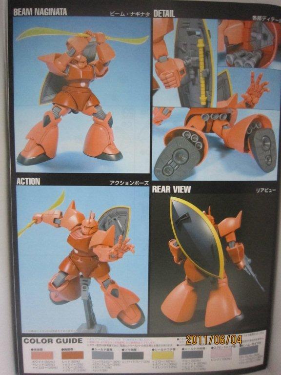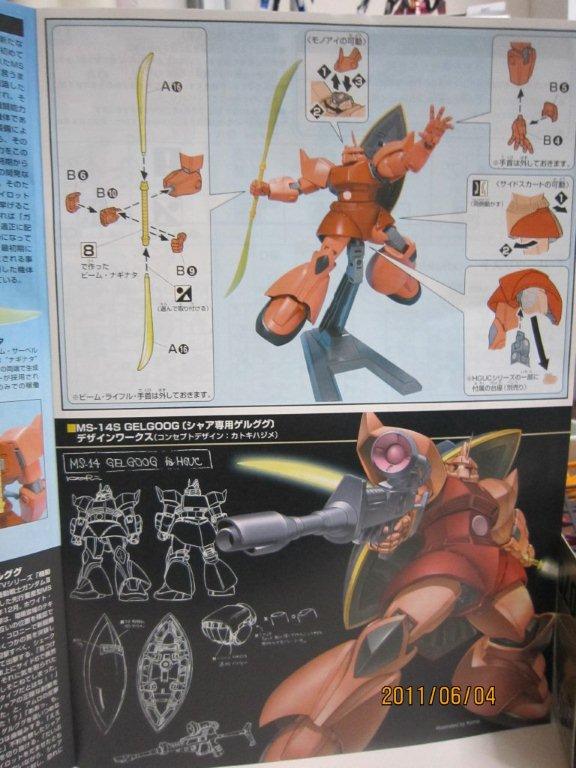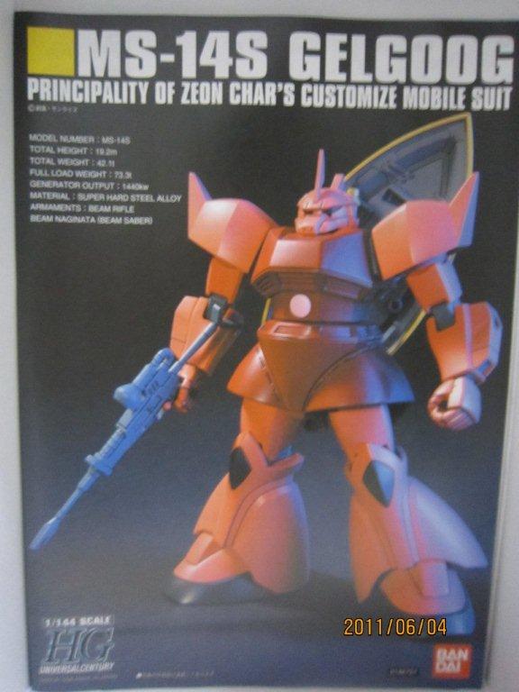 箱です。 説明書。 ○機体説明 ジオン公国軍のMSとして初めてビームライフルを装備した機体である。各種ビーム兵器及びシールドの装備等、連邦側の名機ガンダムの影響が強く見られる。 次期主力MSの座をギャンと争い、性能面においてギャンを破り主力MSとして採用された。この次期主力機をめぐる競作、という記事の初出は「ガンダムセンチュリー」で、以後『モビルスーツバリエーション』などプラモデルの解説にも使われている。今のところ、ゲームを除き映像作品では語られていない非公式設定である。 スペック上の機体性能はガンダムと互角ないしそれ以上であり、量産機のレベルとしては破格の高性能機である。この機体が量産されるのがあと1か月早ければ一年戦争の行く末が変わっていたかも知れないとも言われている。 ○開発経由 ジオン軍はザクIIF型に代わる次期主力MSの開発に着手、既に宇宙戦用にはツィマッド社の開発したリック・ドムの採用が決定しており、競合に敗れたジオニック社の高機動型ザクII 後期型 (MS-06R-2) のデータをベースに開発が進められた。ジオニック社はこの次期主力MSの開発にあたり、地球連邦軍のMSを意識したコンセプトに基づいて着手した。すなわちエネルギーCAPを搭載したビームライフルと、近接用兵器としてのビームサーベルの採用である。 この次期主力MS(=ゲルググ)の開発プランは当初MS-11として進められた。高機動型ザクII (MS-06R-2) の前に既に高機動型ザクII ビーム兵器搭載型 (MS-06R-2P) が試作されていたが、この機体はビームライフルの小型化と高出力化という課題を克服することができなかった。また、俗に先行試作型ゲルググと呼ばれるMS-06R-3はMS-06R-2のうちの1機を改修した機体であり、ジェネレーター出力を向上しビームライフルの開発が続けられた。なお、この機体ではビームサーベルではなくヒートサーベルを採用している。エネルギーCAP関係の設定も「ガンダムセンチュリー」が初出で、かつ今のところ映像で語られたことが無い非公式なものである。ビームライフルの開発にはMIP社が参画して進められたが、その実用化には機体完成から3か月ほど(2か月近くという記述もあり)遅れた。開発の過程でMS-11という型式番号はアクト・ザクに譲ることとなり、ゲルググはMS-14へと改められた。