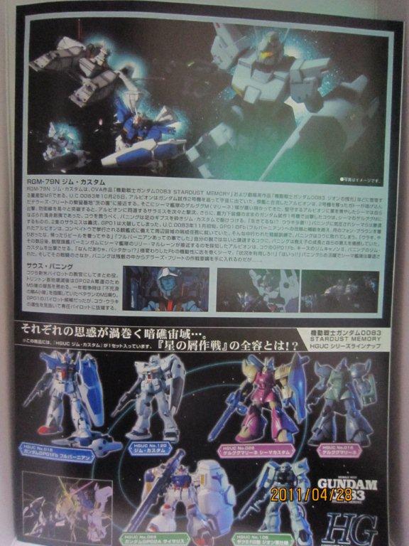 なぜかジム系を続ける傾向・・・ まー6月に「ジムキャノンⅡ」が出るという噂ですし、0083シリーズ熱が今熱い!! 箱です。 説明書。これかっこいいです。 ○機体解説 一年戦争終結後に製造されたジムの性能向上型で、ガンダムNT-1の系譜であるオーガスタ系に属する。従来のジムの倍近い推力とガンダムタイプ並のジェネレーター出力を持ち、デラーズ紛争前後の連邦製量産機としては最上位機として位置付けられる。劇中でも、本機に搭乗したパイロット達が「旧式のゲルググなら楽なもの」と、一年戦争当時の高性能機を見下す発言をしている。一方で、突出した面の少ない無難な機体特性であり、本機の評価を端的に表現すればコウ・ウラキの「特徴のないのが特徴」の言葉に集約される。性能に比例して製造コストも高かったため、実際の配備は少数のエース級パイロットのみにとどまった。 武装は頭部内蔵式の60mバルカン砲2門と、従来のジムとは逆のバックパック右側に1基装備されるビーム・サーベル、「ジム・ライフル」の通称で呼ばれる90mmマシンガンを装備する。本機用のビーム・ライフルは劇中では確認できない[1]。ジム・ライフルは実体弾であるが、ゲルググ・マリーネやドム・トローペンをはじめとするほとんどのデラーズ・フリート所属MSを撃破する威力がある。その他、防御用にジム・コマンド系の曲面型対ビームコーティングシールドを携行する[2]。 デラーズ紛争後は生産ラインが特殊部隊ティターンズの管理下に置かれ、若干の設計変更と共に黒と濃紺(ティターンズカラー)に塗装されたジム・クゥエルの生産に切り替えられた。 ○劇中での活躍 『機動戦士ガンダム0083 STARDUST MEMORY』第3話から登場。ジオン公国残党軍デラーズ・フリートに強奪されたガンダム試作2号機の奪還任務を受けたペガサス級強襲揚陸艦アルビオンに3機が配備され、同艦のMS隊隊長サウス・バニング、補充パイロットのアルファ・A・ベイトとベルナルド・モンシアが搭乗する。モンシア中尉は配属直後の本機をバニング大尉に無断で持ち出し、コウ・ウラキ少尉操縦のガンダム試作1号機と模擬戦を行った。 第4話では、ノイエン・ビッター少将が指揮するキンバライド基地防衛隊と交戦。ドム・トローペン4機を含むMS部隊を母艦アルビオンとの連携で全滅させるも、後期量産型ザクIIの攻撃でベイト中尉機が被弾、戦闘不能となった。 第5話では、シーマ・ガラハウ中佐率いるシーマ艦隊とアルビオンのジム・カスタム部隊が交戦。ゲルググ・マリーネ部隊と激戦を繰り広げた。戦闘終盤、シーマ専用ゲルググ・マリーネに圧倒されたガンダム試作1号機を救うべく、バニング大尉がジム・カスタムで初出撃している。バニングはゲルググ・マリーネを1機撃墜し、シーマ機を撤退させた。 第8話では、シーマ艦隊と遭遇した戦艦バーミンガムを援護すべく、バニング大尉搭乗の本機がガンダム試作1号機 " フルバーニアン" 、ジム・キャノンIIを率いて出撃した。バニング機は再びシーマ中佐と交戦。シーマ専用ゲルググ・マリーネが発射した110mm速射砲弾が機体の右腹部に命中する。当初は問題なかったが、損傷が拡大し、母艦へ戻る途中に爆発を起こした。バニング大尉は戦死し、機体は失われた。残されたジム・カスタム2機は、その後もアルビオン所属機として活躍。デラーズ・フリートのMSを多数撃墜した。 劇場版アニメ『機動戦士ΖガンダムIII A New Translation -星の鼓動は愛-』では、ジム・キャノンIIと共にエゥーゴ側の戦力として配備されている様子が、背景的に数カット描かれている。正規カラーのブルーグレーの機体のほかに、ジムIIと同様のエゥーゴカラーで塗装された機体も登場する。 ○ひとこと 久しぶりにリアルタイムなので、プロ野球の巨人情報 ヤクルト4-1巨人(草薙)で負け。3連敗。3日間打てない、打たれるで全く同じ内容。ヤクルトが良すぎるって話もあるけども・・・ まーピッチャーはS級じゃーないので、そこそこがんばった気がしますが、打てない、策なしで3たては良くない!! エラーで調子くるったなら2軍に行きな「脇谷」。 小笠原さんたのみますよーー。本当にたのみますよー。 まーまだ序盤ですけども、期待の出来る試合内容をお願いしたい今日この頃。 ホームゲームが出来ない、阿部負傷と条件は悪いですが「がんばれジャイアンツ!!」