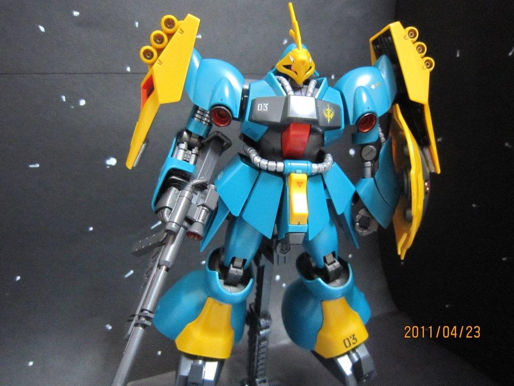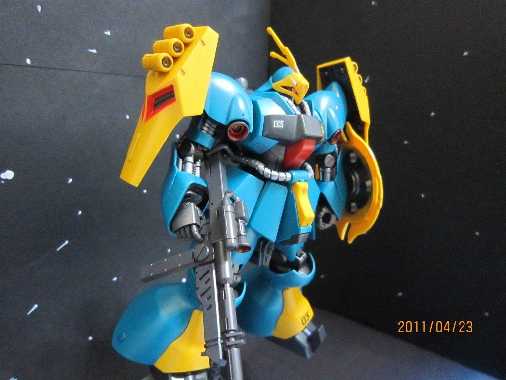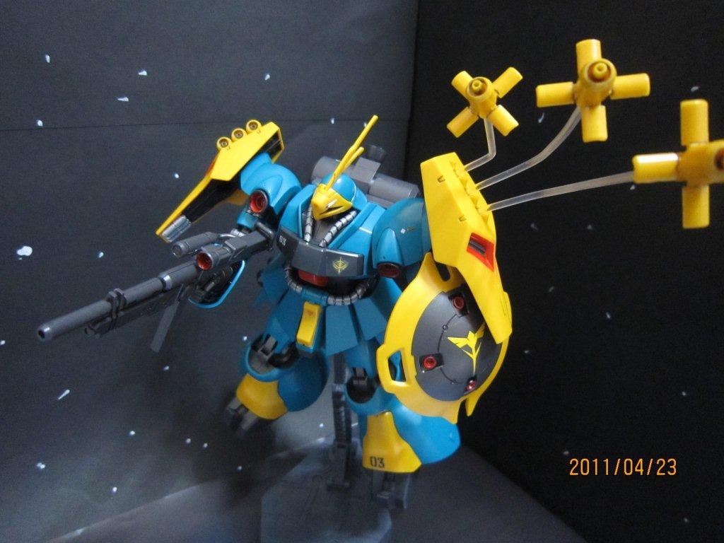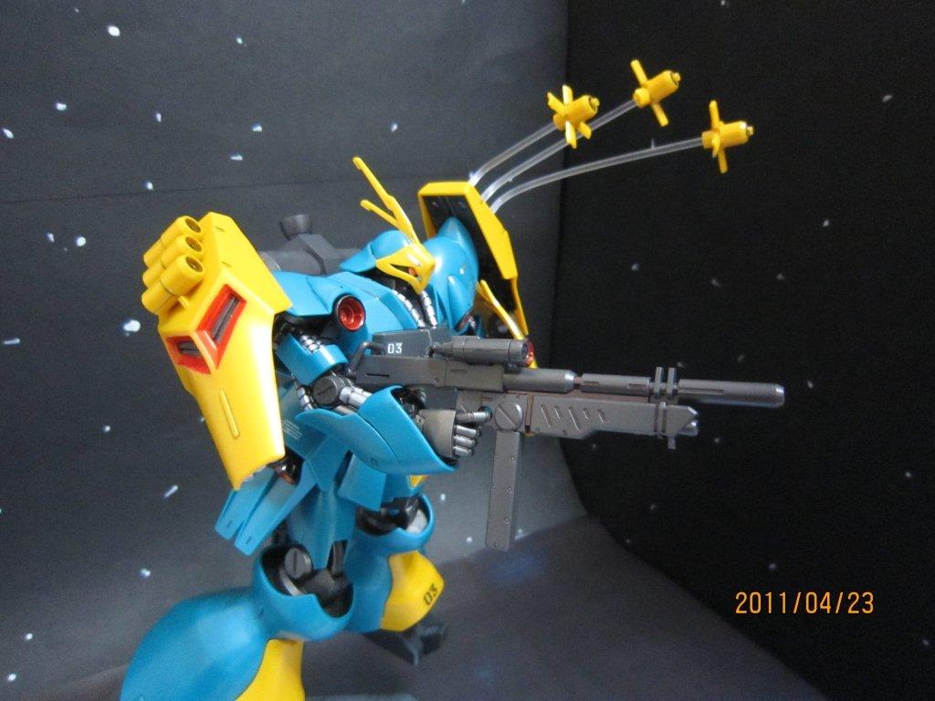 背景は「宇宙」です。なんかピカピカしてますねー。照明失敗。 デカールとザクⅡF2にあったシール「03」を張りました。 部分塗装で「赤」くしたところは ・バーニア内部 ・ライフルのスコープっぽいところ ・肩と後ろの赤いところ。(これが大変だった・・・) 部分塗装で「シルバー」にしたところは ・首、腰のケーブル? ・腕のところ ファンネル放出シーン。 後ろから。 なんか、もう少しスミ入れを丁寧にしたほうがいいなー。反省。