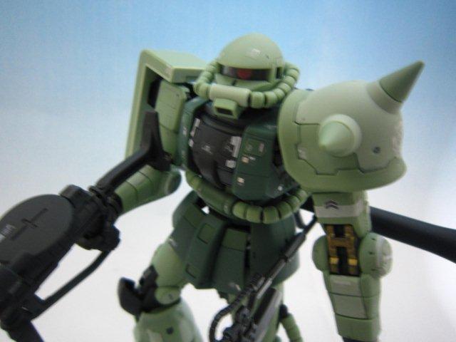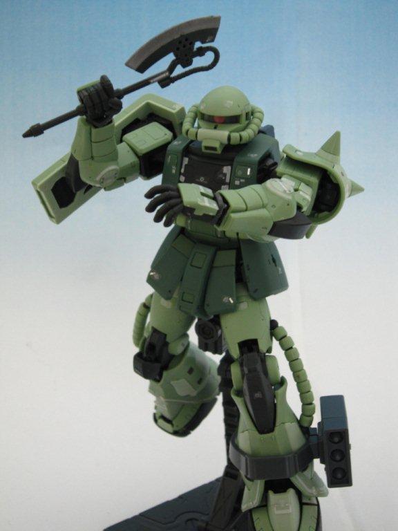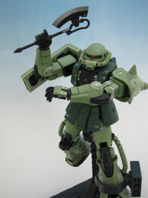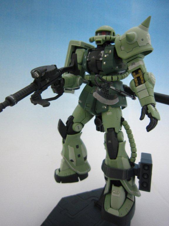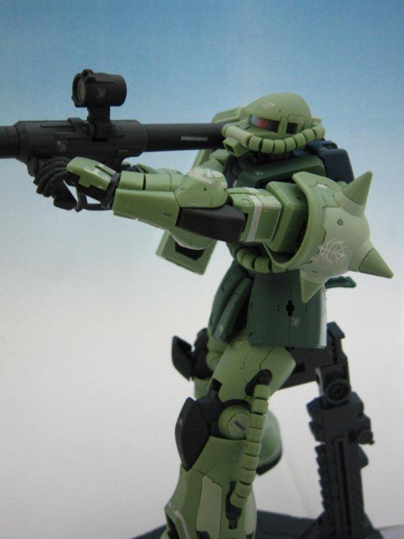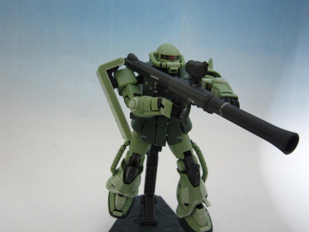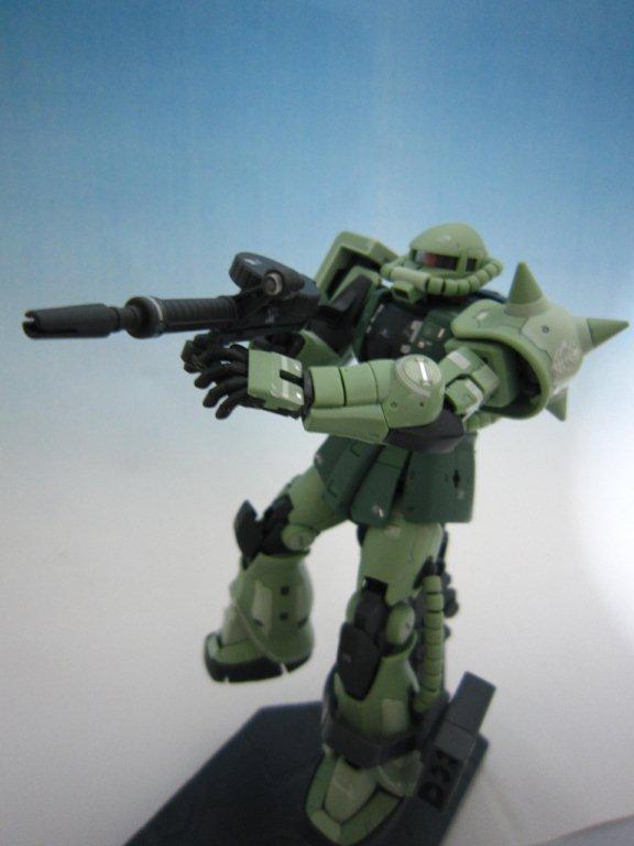 RG量産型ザクをつや消しスプレーし、本当に完成です。 軽い完成レビューです。 足にある武器はザクⅡF2の付属武器を装着してみました。 アクションベース2を使用しています。